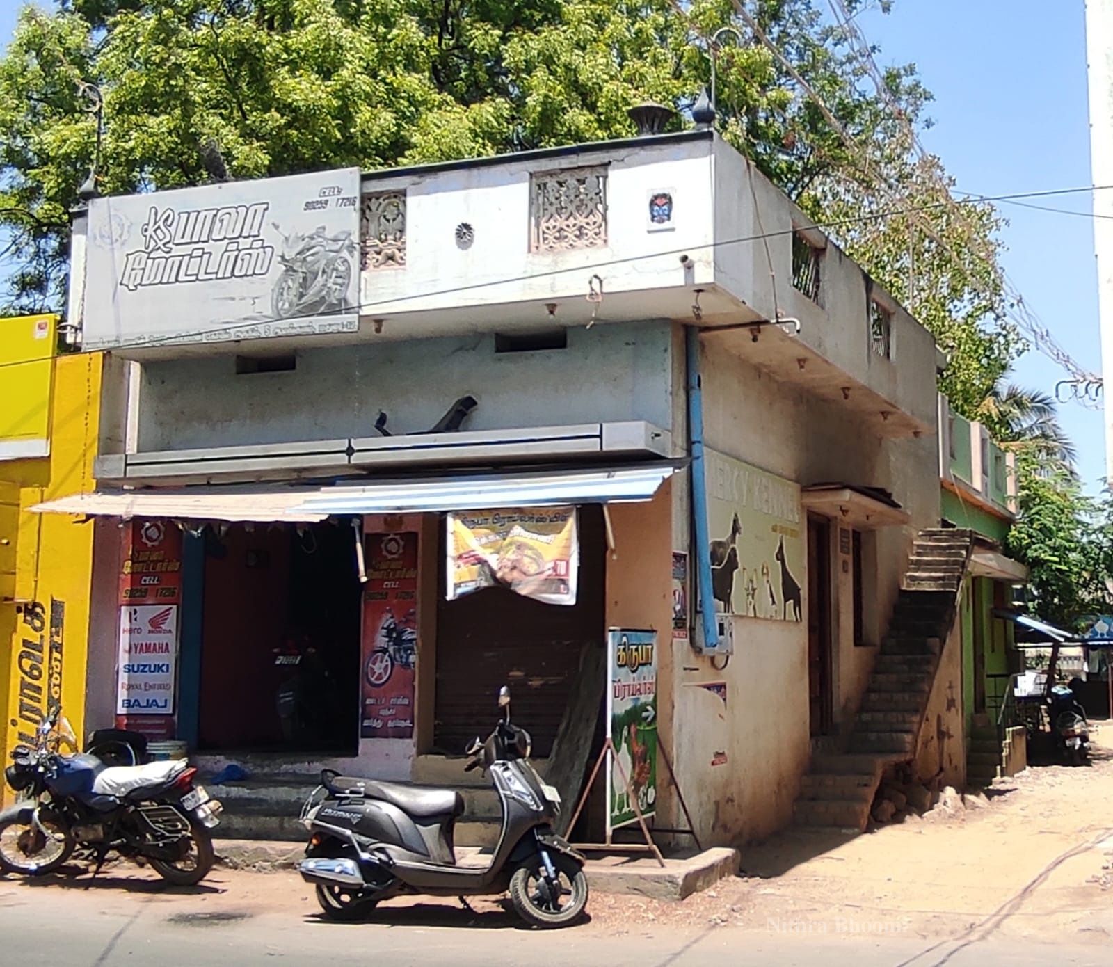 ரோட்டிற்கு முன் இரண்டு கடை மற்றும் ஒரு வீடு இணைந்தபடி மற்றொரு வீடு அமைந்துள்ளது,